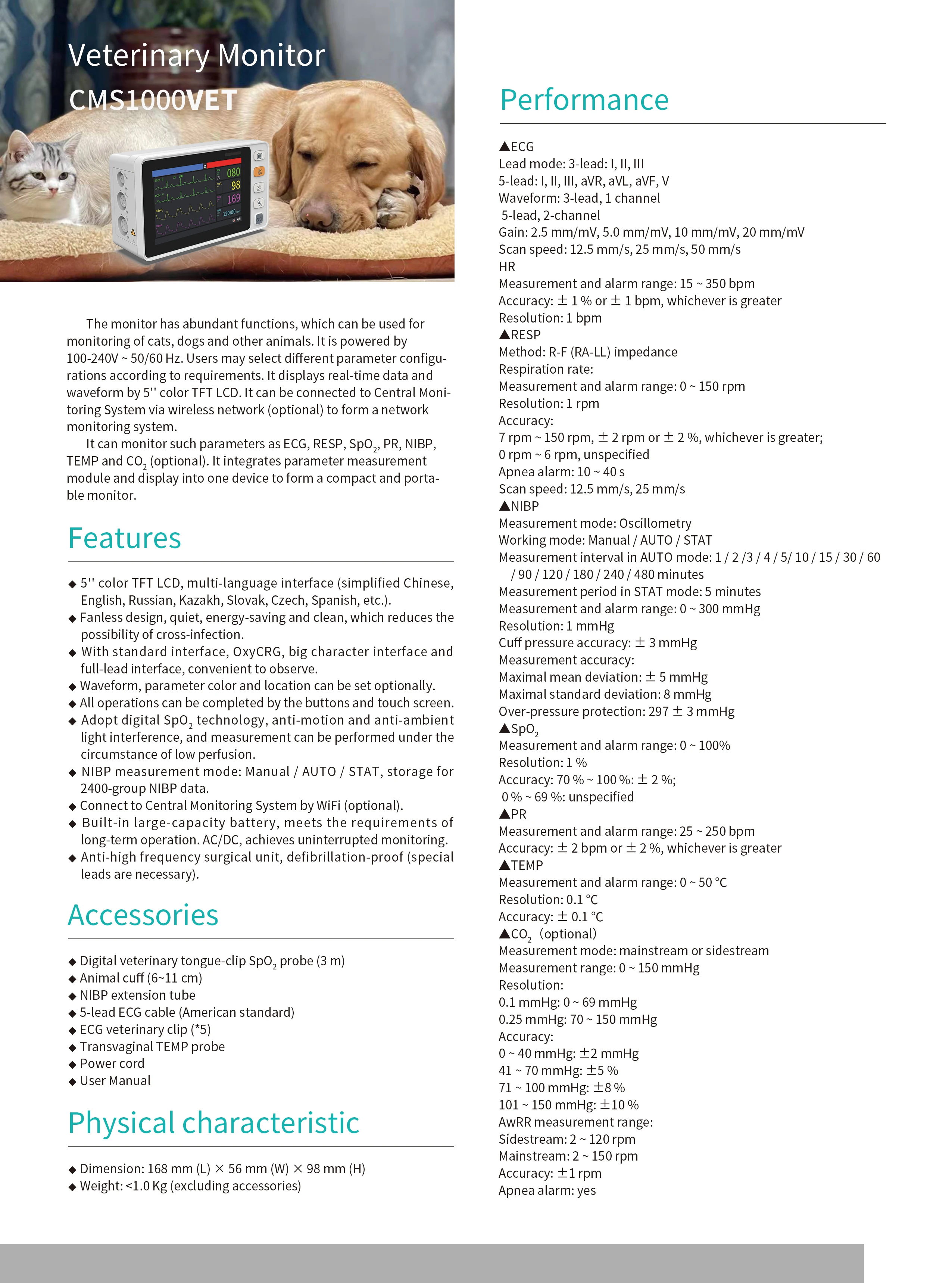 The monitor has abundant functions, which can be used for monitoring of cats, dogs and other animals. It is powered by 100-240V ~ 50/60 Hz. Users may select different parameter configurations according to requirements. It displays real-time data and waveform by 5" color TFT LCD. It can be connected to Central Monitoring System via wireless network (optional) to form a network monitoring system. It can monitor such parameters as ECG, RESP, Sp0,, PR, NIBP, TEMP and CO2 (optional). It integrates parameter measurement module and display into one device to form a compact and portable monitor.