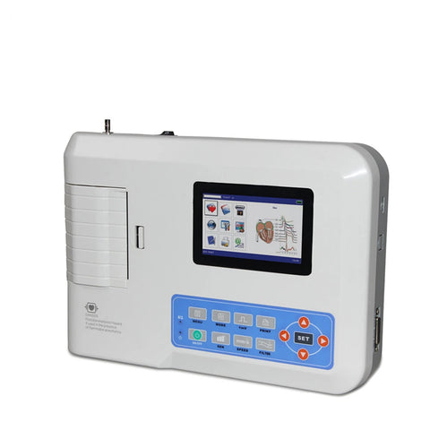 ECG300GT is an Electrocardiograph which can collect 12-lead ECG signal and print waveform by the thermal printing system. It features in: recording and displaying ECG waveform in AUTO/Manual mode, measuring and diagnosing ECG waveform parameters automatically, prompting for "Lead off" or "Lack of paper", multi-language interface, case database management.