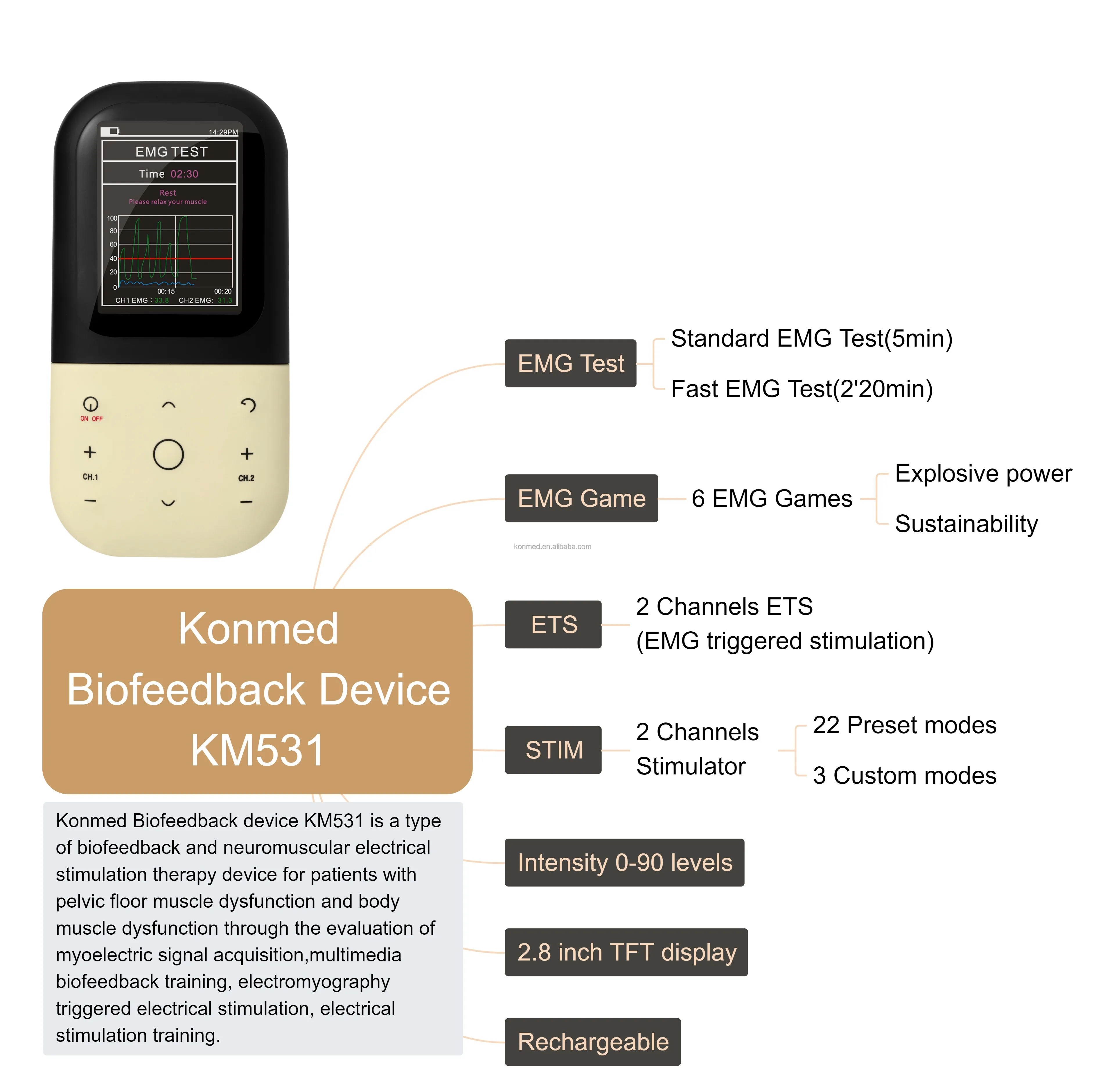 JYTOPMED Biofeedback device KM531 is a type of biofeedback and neuromuscular electrical stimulation therapy device for patients with pelvic floor muscle dysfunction and body muscle dysfunction through the evaluation of myoelectric signal acquisition, multimedia biofeedback training, electromyography triggered electrical stimulation, electrical stimulation training.