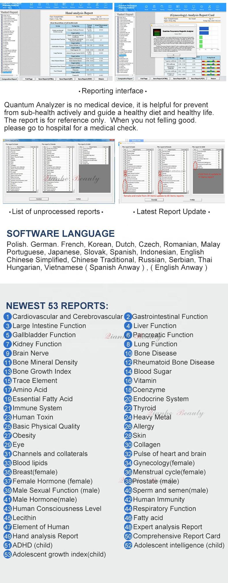 Our quantum health diagnostic instrument can make a comprehensive examination to human body. After the test, 38 health reports can be obtained.