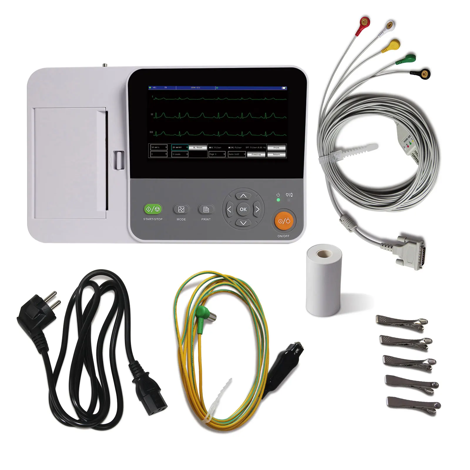 ● Display 3/6/12 - lead ECG waveform, print mode, sensitivity, paper speed, filter status, etc.