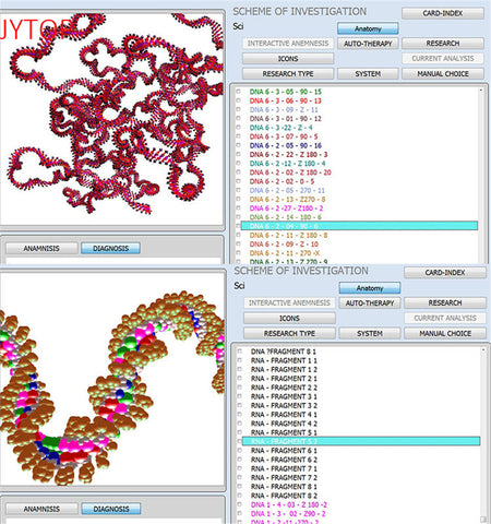 an advanced Non-Invasive Diagnostic Device for physical examination & analysis system, using the light wave resonance to scan and detect the functional status of the Human body or to trace the gradually formed abnormal conditions up to the eight levels: entire organ, tissue, cell, nucleus, chromosome, DNA helix, ultrastructure or molecule, then provides treatment.