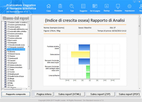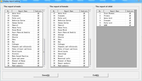 The newest 36 reports Quantum Resonance Magnetic Analyzer : 1. Cardiovascular and Cerebrovascular 2. Gastrointestinal Function 3. Liver Function 4. Gallbladder Function 5. Pancreatic Function 6. Kidney Function 7. Lung Function 8. Brain Nerve 9. Bone Disease 10. Bone Mineral Density 11. Bone Growth Index 12. Rheumatoid Bone Disease 13. Blood Sugar 14. Basic Physical Quality 15. Human Toxin 16. Trace Elements 17. Amino Acid 18. Heavy Metal 19. Immune System 20. Endocrine System 21. Prostate 22. Male Sexual Function 23. Skin 24. Allergens 25. Element of human 26. Obesity 27. Bone Growth Index 28. Coenzyme 29. Sperm and semen 30. Blood lipids 31. Channels and collaterals 32. Pulse of heart and brain 33. Element of human 34. Gynecology (Female) 35. Breast(Female) 36.Element of human
