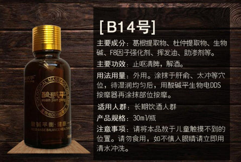 Usage and dosage: External use. Apply to acupoints such as Ganshu and Taichong. After they are evenly moistened, level the bio-electrical DDS massager with acid and alkali and then rub the parts with massage.