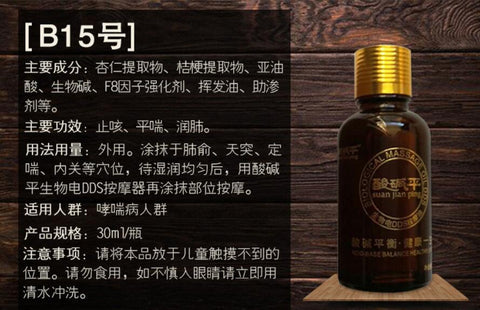 Usage and dosage: External use. Apply to acupoints such as Feishu, Tiantu, Dingchuan, Neiguan, etc., after they are evenly moistened, level the bio-electrical DDS massage device with acid and base, and then rub the area.
