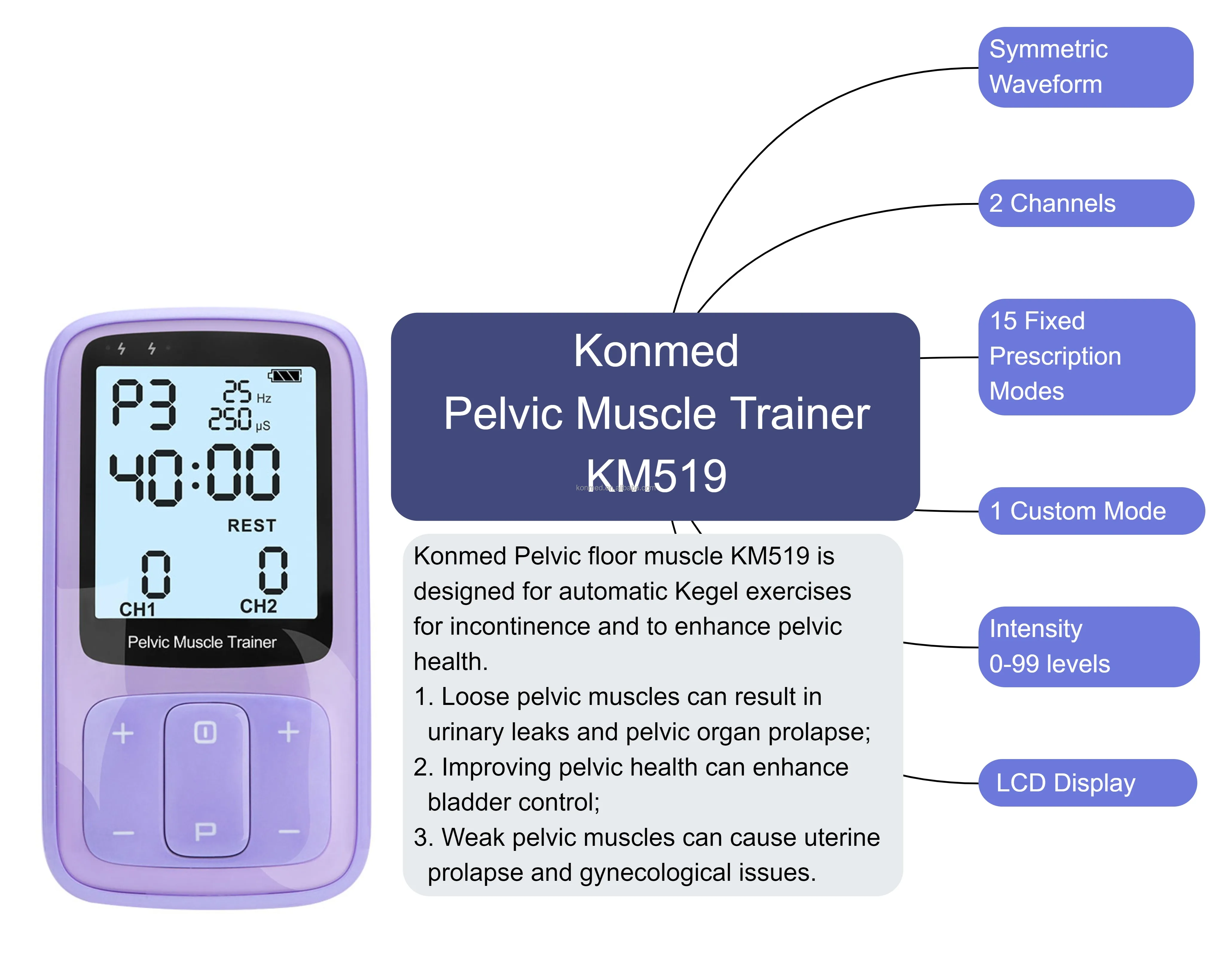 The pelvic organs, including the bladder, uterus, ovaries, fallopian tubes, vagina, prostate, and seminal vesicles, are all supported and anchored in place by the pelvic floor muscles. Konmed KM519 is designed for automatic Kegel exercises for incontinence and to enhance pelvic health. 1. Loose pelvic muscles can result in urinary leaks and pelvic organ prolapse. 2. Improving pelvic health can enhance bladder control. 3. Weak pelvic muscles can cause uterine prolapse and gynecological issues.