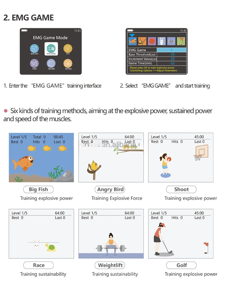 Four operation modes (EMG Test, EMG Game, ETS, and STIM) have been set up to assist patients in exercising.