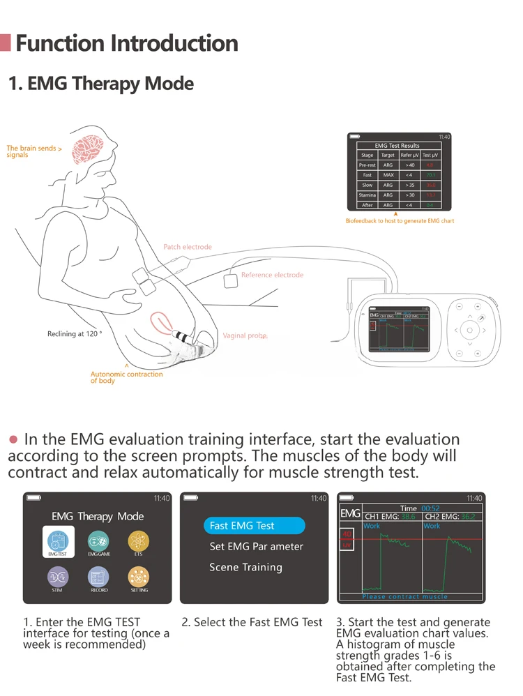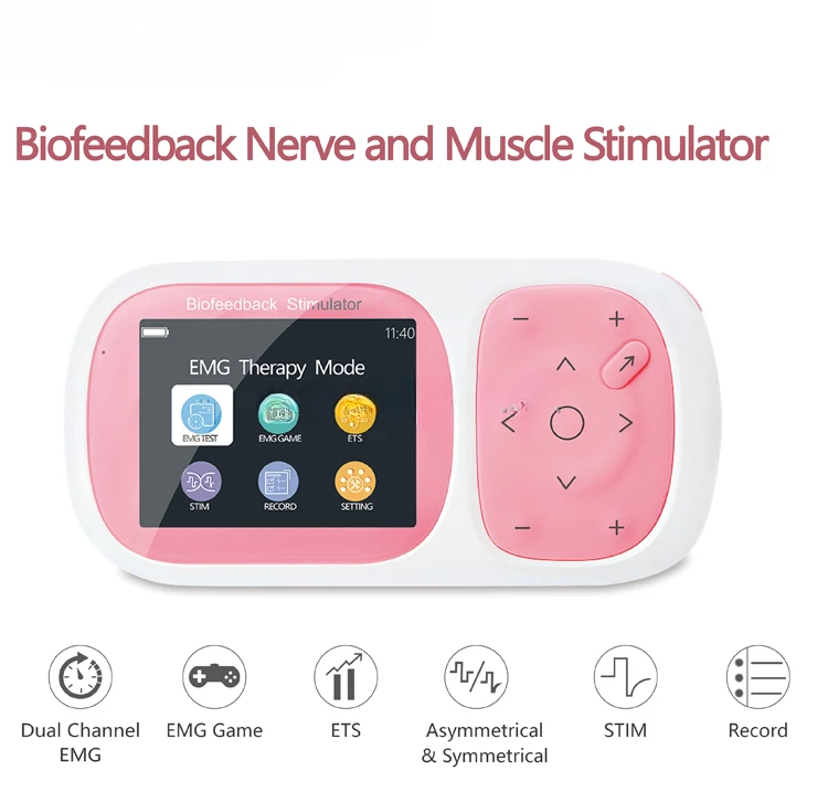 This Biofeedback device is a new type of biofeedback and neuromuscular electrical stimulation therapy device for patients with muscle dysfunction through the evaluation of myoelectric signal acquisition, multimedia biofeedback training, electromyography triggered electrical stimulation, passive electrical stimulation training and treatment. Perform routine muscle training, combined with individualized electrical stimulation therapy, awaken and activate muscles, accelerate the recovery of muscle tone and elastic, and have a good effect on preventing and treating muscle disorders.