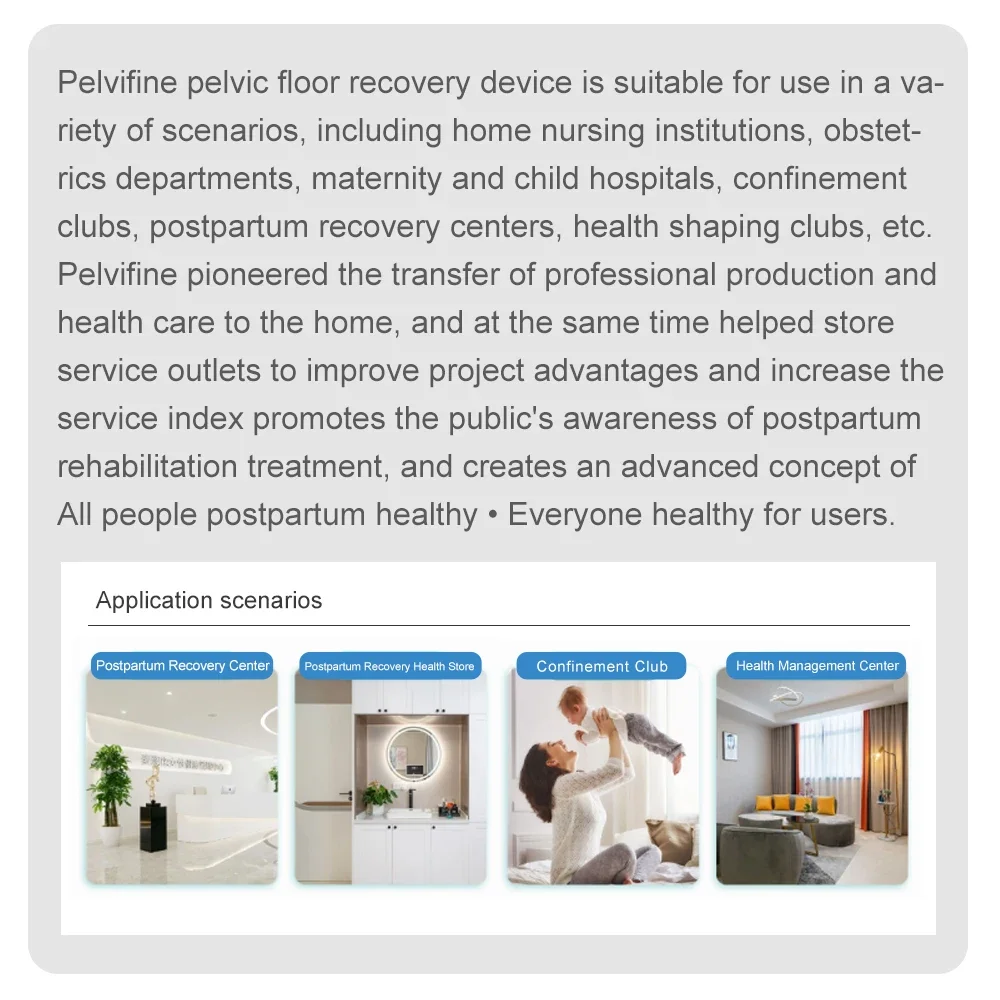 Pelvifine pioneered the transfer of professional production and health care to the home, and at the same time helped store service outlets to improve project advantages and increase the service index promotes the public's awareness of postpartum rehabilitation treatment, and creates an advanced concept of All people postpartum healthy, Everyone healthy for users.