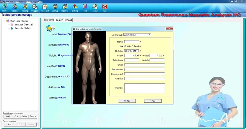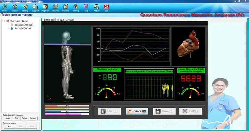 The quantum resonance magnetic analyzer collects the frequency and energy of the human body's weak magnetic field, and then transmits the human body information to the database through a handheld sensor. Then a comprehensive report on sub-health and expert advice on how to improve physical health are given.