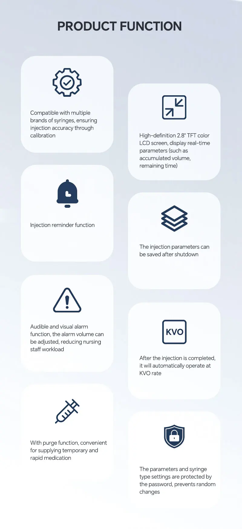 1. Be compatible with multiple syringe brands. The injection accuracy can be guaranteed by calibrating.